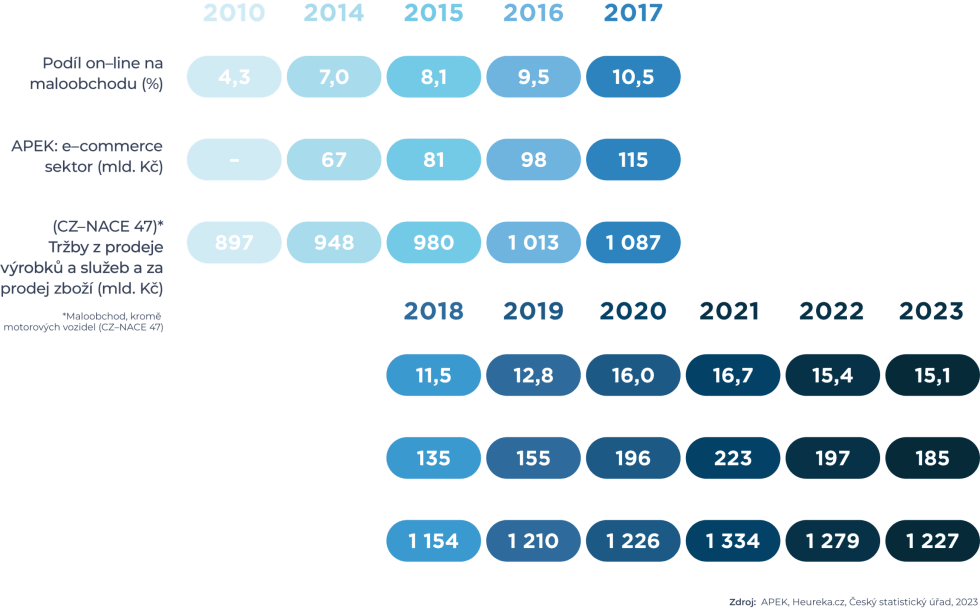 Podíl e–commerce na českém maloobchodě rostl meziročně o jeden procentní bod, což znamená, že v oblasti retailu dosahuje již 17 %. S ohledem na propojení tradičního prodeje i on–line obchodů lze očekávat, že i v budoucnu se bude význam internetového prodeje zvyšovat.