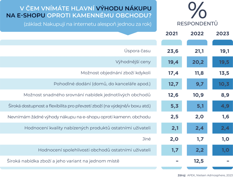 Úspora času, možnost objednat zboží kdykoli, pohodlné doručení a samozřejmě výhodně ceny – tak vnímají hlavní benefity z on–line nakupování spotřebitelé. E-shopy jednoznačně přináší pozitivní zákaznickou zkušenost a pohodlí při nákupech.