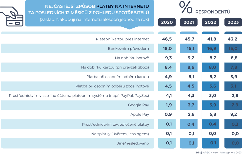 Platba kartou v posledních letech vévodí on–line nákupům. Ať jde o úhradu přímo během nákupu v e–shopu nebo při převzetí zboží, nahradily karty hotovost významným způsobem. Pokles lze vnímat také u přímých bankovních převodů. Svou roli na druhé straně hrají nové moderní platební způsoby jako Google a Apple Pay.